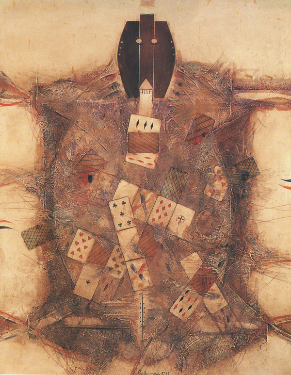 Так, обыкновенные карты полуожиданно упали на поверхность — основу, смешались с ее фактурными шумами, не теряя своего «чужеродного» естества. Выйдя из своей хотя и романтизированной, но все же бытовой сферы, карты мерно врастали в небытовое, но Бытийное пространство новой живописи, приручались средой, обретая дополнительные смысловые «интонации».