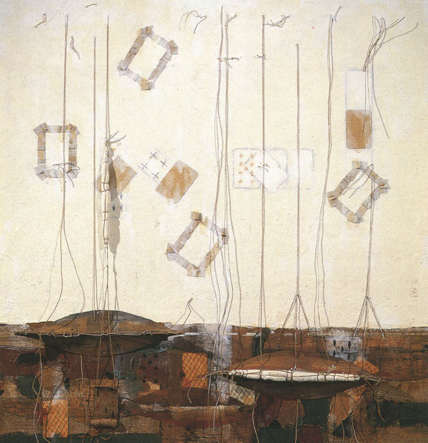 Многослойность письма совпала с многослойностью смысла, с ненавязчивым полем сторонних ассоциаций. Пожалуй, ломберный цикл был своего рода избытком материализации. В дальнейшем путь смелого, азартного экспериментатора дал еще один неожиданный сдвиг на сей раз в сторону Белизны и Просветленной опустошенности абстрагируемого пространства. Предметный знак здесь уже в полной мере развеществлен до стадии ускользающего флюида -фигурность карты здесь сведена к минимуму осязаемого присутствия, хотя, быть может, именно здесь осязание вступает в силу: прорезь (как от ножа) вскрывает застывшую белую (как левкас) твердь основы, магическим чертежом надсекает поверхность контурные очертания карт (последние носители изобразительности), порою нейтрально-разреженная белизна сгущается в выпуклости рельефных тиснений, что заставляет подозревать здесь какой-то замурованный коллаж, изредка проступающий через белую массу покрытия, заставляя поверхность топорщиться и исторгать намеки. Художник не удерживается на стадии разреженной пустоты — визуального молчанья — его темперамент пробуждает всплески чувственности, ритмику игровых комбинаций даже в этом столь отрешенном мире.