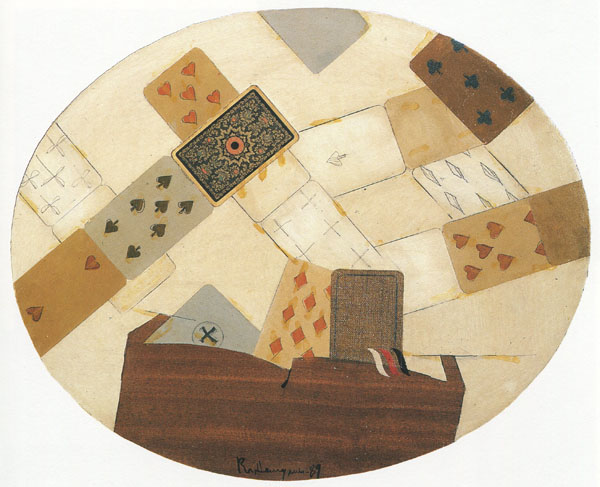 Какими-то судьбами занесенная в беспредметность живописного пространства, вкрапленная в сочный монохром письма эта колода, крапленная лишь наплывами живописных подтеков, напоминала о судьбе — Фатуме и игре обстоятельств уже самым парадоксальным фактом своего возникновения. Далее она кочует из картины в картину, из цикла в цикл. Так были проложены мосты между мифом житейских реалий и беспредметьем чистой пластики. Вся многозначительность карточного ряда (этого набора плоских бумажек) была введена в поле игры, но в данном случае — игры искусства.
