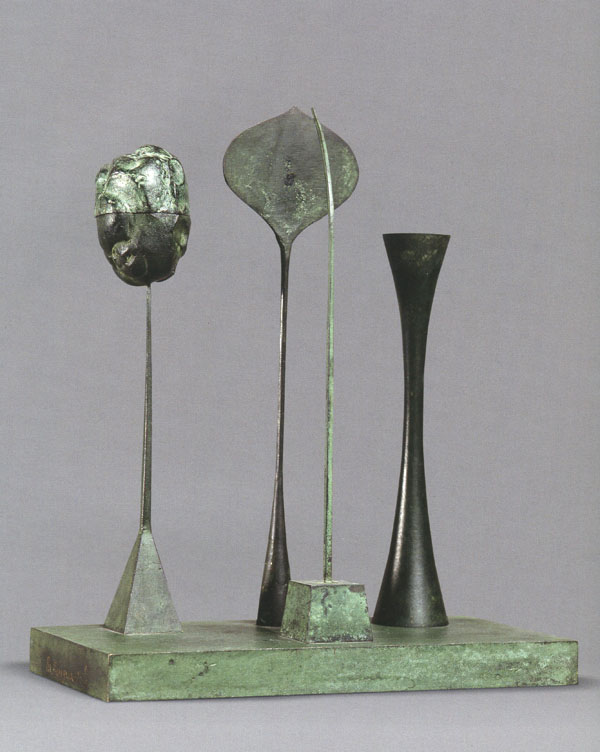 Учитывая такую «межжанровость», мы можем, например, определить это как своего рода «квазинатюрморт», и тогда отчужденная фактура отливки, исподволь окрашиваясь «аурой» рукотворности, напомнит о магически притягательной преображенной предметности, доселе знакомой лишь по сугубо картинным пространствам. Или же это своеобразный авторский отклик на проблематику современной предметной скульптуры, образный источник которой, однако, коренится в воскрешаемом прошлом. Это можно определить и как своего рода мини-инсталяцию, где репрезентирующий жест экспонирования-водружения в среде вычленения из посторонних (внешних) пространств наделяет предметно-структурную микросреду сакральным статусом территории, завоеванной искусством у жизни. За внешней простотой «оболочек» и расклада на плоскости проступают взаимообратимость материала, предмета, знака, как и перверсия жанра в целом: здесь объект «притворяется» натюрмортом, а последний, в свою очередь, не столько изображает вещи, сколько овеществляет в пластическом шифре скрытые «за кадром» экзистенциальных связей или вовсе является порогом к неведомому. Однако в целом конкретное, доступное чувственному восприятию «как на ладони» натюрморто-образное изваяние обретает значительность, весомость, силу воздействия, многомерность смысла, покоясь на обозримой плоскости-подставке — «постаменте», покоясь монументально при всей камерности масштабов. Вспомним, что в приобщении вещности к Вечности и к Бытию нераскрытых тайн многое сделано художниками, обычно связываемыми в московском неофициальном искусстве 60—70-х годов с линией художественной «метафизики», часто в своем пластическом языке тяготевшими не только к знаковой абстракции (Штейнберг, Шварцман), но (и очень часто) к предметности своеобразного «магического реализма» (Вейсберг, Краснопевцев, Плавинский, Соостер, Свешников). Иконические отсылы к творчеству носителей этой традиции (прежде всего Вейсберга) здесь очевидны. Как и у них, созерцаемые предметы, а в данном случае своего рода слепок памяти об их живописных перевоплощениях выступал к зрителю многозначительно молчаливой пластической формулой, устанавливают с ними «обратную связь», настраивают на выявление свойств криптограммы, знака-проводника, архетипа в обыденном предметном окружении — явление овеществляет весть, знаменуя прикосновение к Тайне. В данном случае это прежде всего таинство припоминания, тайна искусства в его непрерывных тонких взаимосвязях. Проводником смысла оказывается сквозной.мотив «искусства в искусстве» от уже упомянутых обращенных цитат живописи (особо наглядно в посвящении В.Вейсбергу) до воссоздания общего интимно-средового мироощущения, присущего миру «неофициального искусства» Москвы в 60—70-е годы, имея в виду тот специфичный «предметный фонд», который был характерен для той среды, своеобразно у каждого отразившийся в пластическом видении.